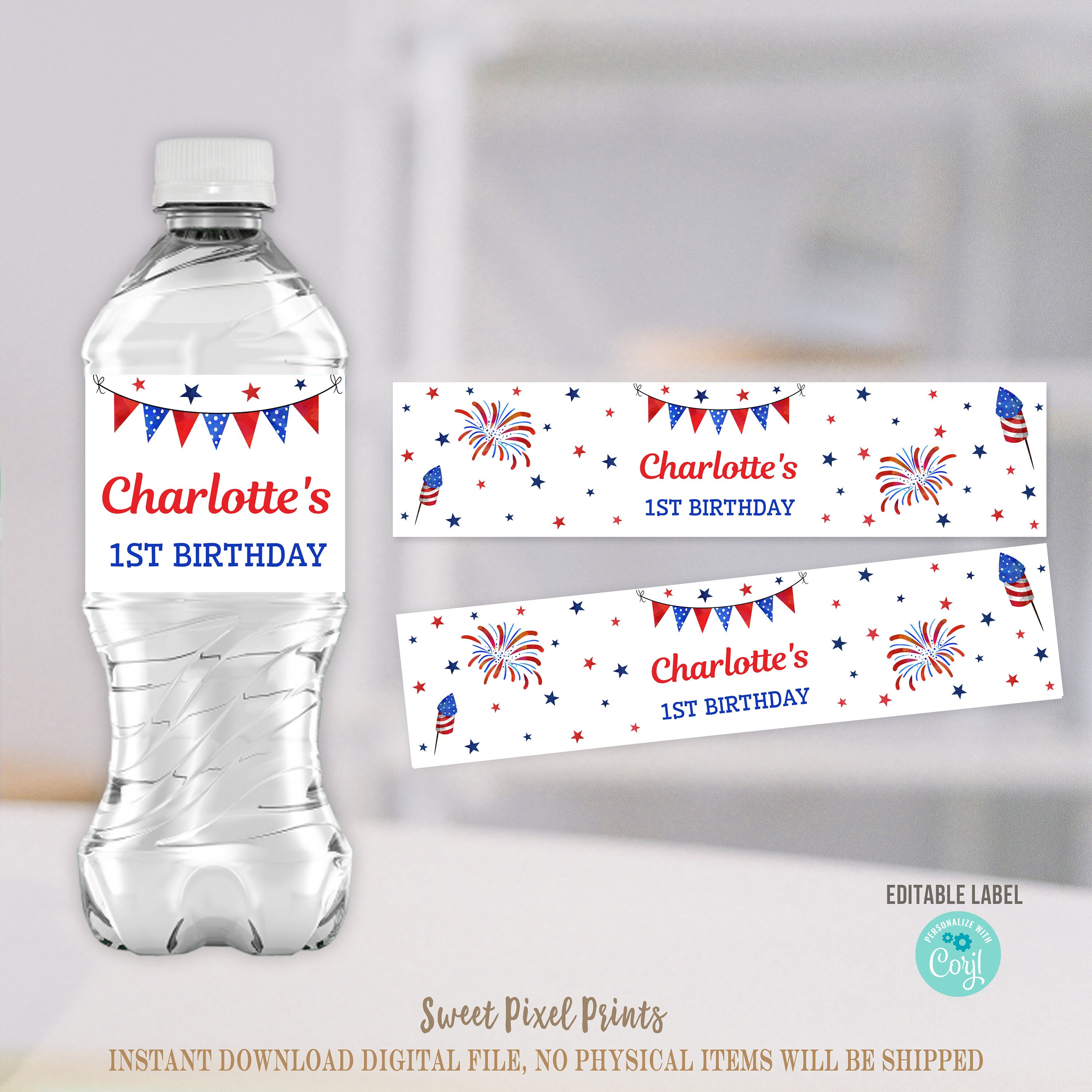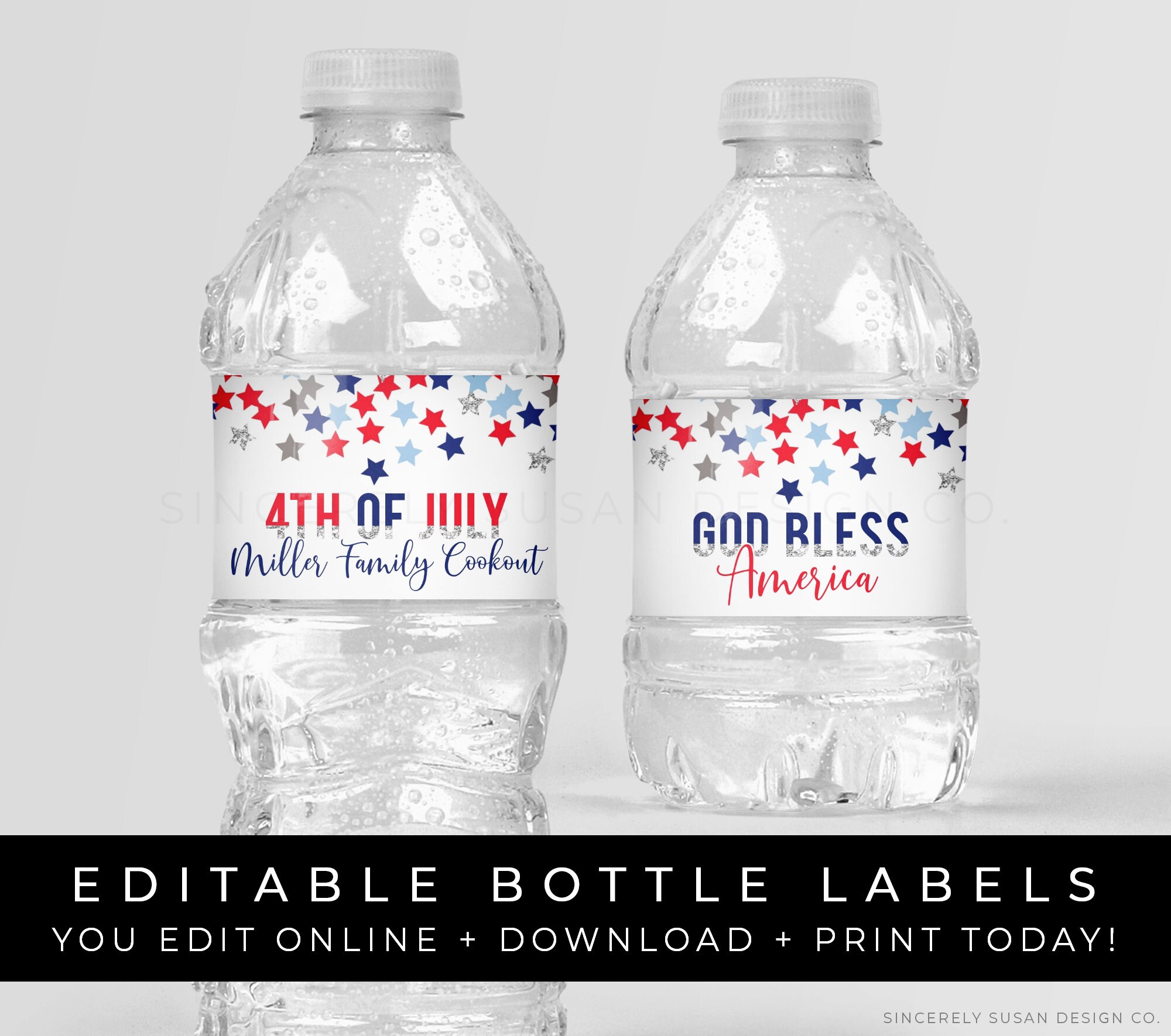 Fourth of July Water Bottle Labels template - SIMONEmadeit Parties These Fourth of July Water Bottle Labels are the perfect way to dress up plain water at your Independence Day BBQ or party. Each label has classic red, white and blue stars & stripes. They come with the text 'Happy Fourth of July!' already typed in, but you can type ... Personalize easily at home for July 4th BBQ or party decorations. Download now!