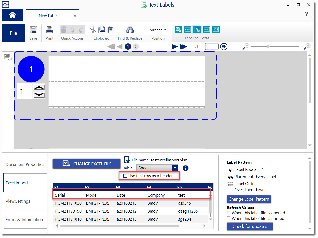 Labels from excel sheet